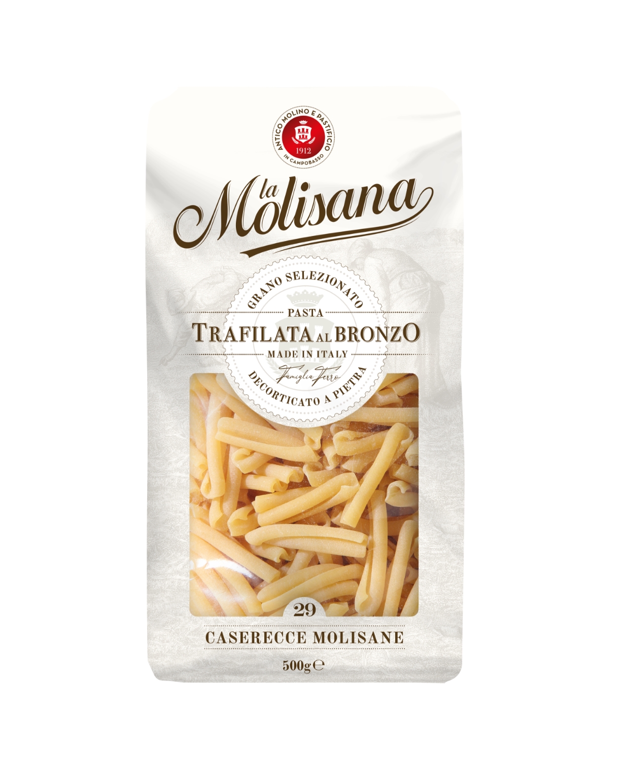 Nuestras Caserecce Molise 29 celebran la producción local y tienen una forma deliciosa que, con sus entradas, es perfecta para recoger el condimento.