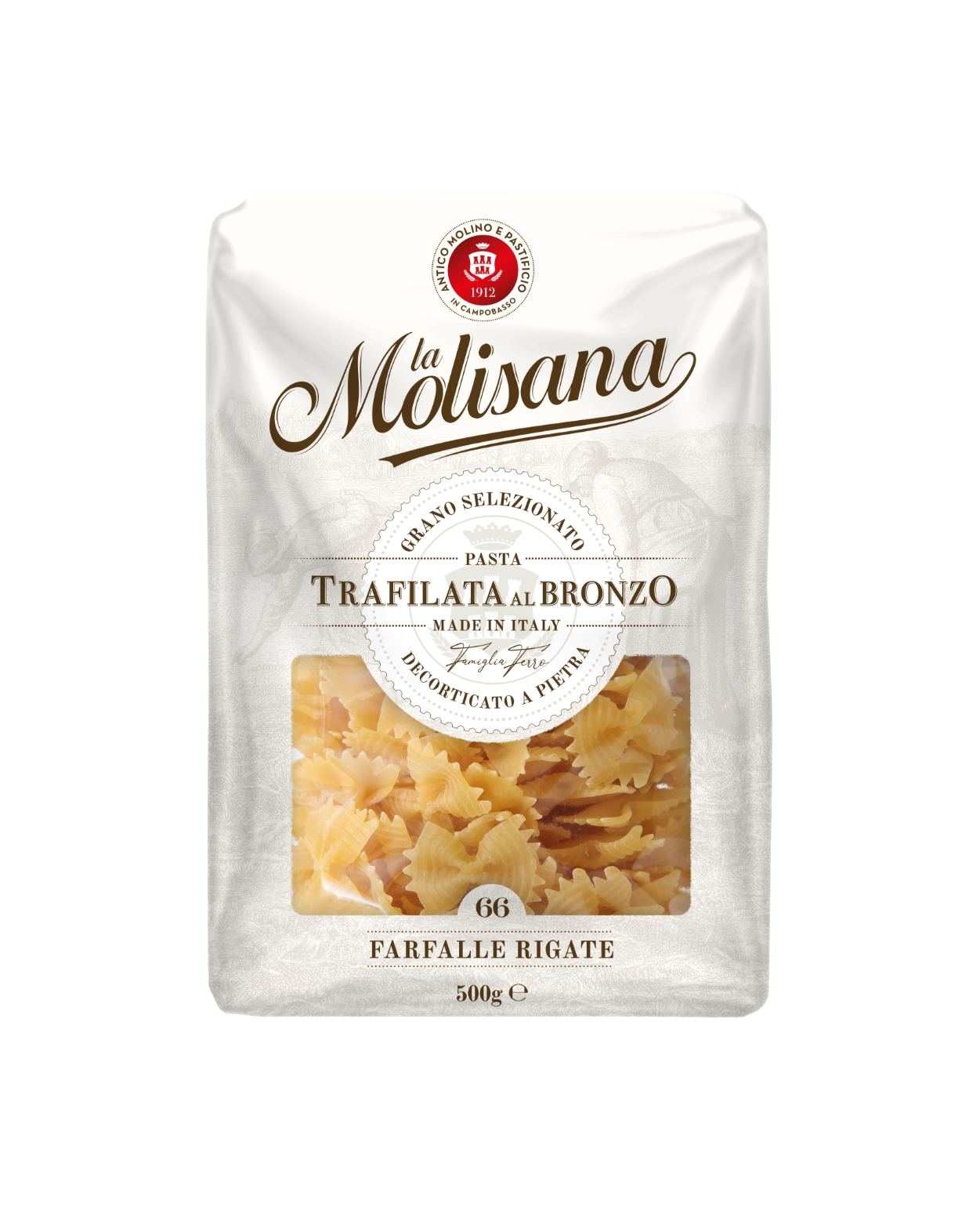 Las farfalle La Molisana son de tamaño robusto, con alas grandes y proporcionadas y rayas claras que las hacen no solo hermosas a la vista, sino también extraordinariamente sabrosas.